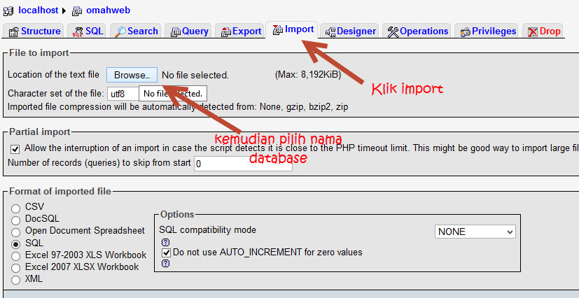 Misalkan kita create database dengan nama database omahweb, setelah itu kita klik nama database tersebut di menu kiri untuk memilih database. Dan selanjutnya kita import file database omahwebsite.sql yang tersedia dalam paket CMS Toko Online Lokomedia Omahwebsite, yang sudah sobat extract di folder c:/xampp/htdocs/ tokoonline