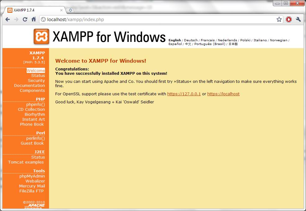 Pada address bar browser ketikkan localhost, maka jika langkah install xampp diatas sukses dilakukan, maka akan muncul tampilan seperti dibawah ini :