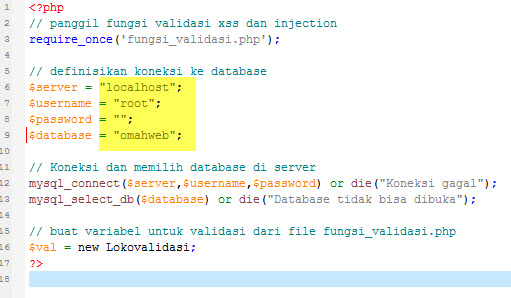 Kita buka folder config di c:/xampp/htdocs/ tokoonline dan kita buka file koneksi.php dengan menyamakan nama database yang sudah kita create di phpmyadmin tadi, seperti tampilan berikut :