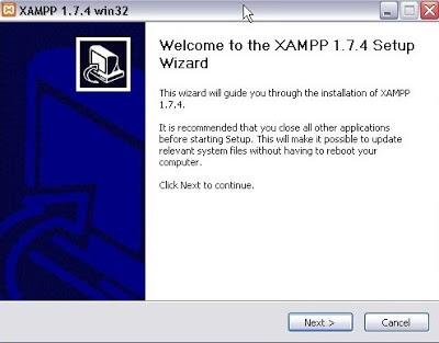 Sebelum kita mulai, kita siapkan terlebih dahulu peralatan perangnya, yaitu Xampp versi 1.74, ini digunakan untuk membuat semacam hosting bayangan (Virtual Hosting) di PC atau Laptop atau Lepi kita, tanpa koneksi internet.